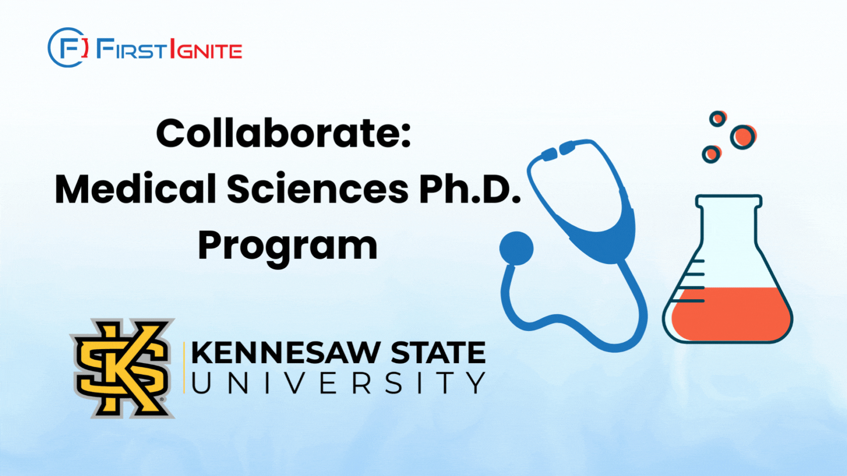 Kennesaw State University has partnered with FirstIgnite to find collaborative partners for their Medical Sciences Ph.D. Program. The program provides Ph.D. candidates with industry-focused skills, projects, and programs to better prepare them for corporate careers. The curriculum covers subjects such as scientific communication, drug discovery and development, and provides opportunities for dissertation research and seminars.