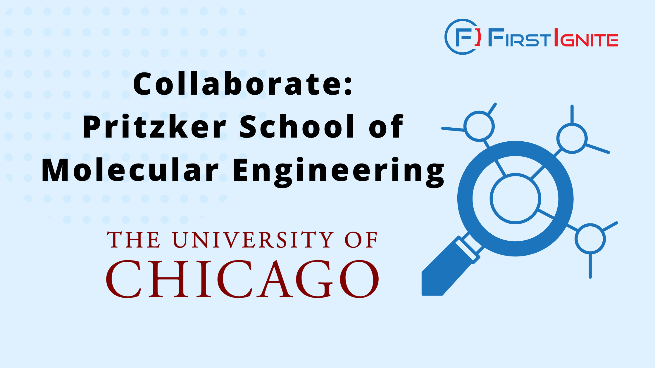The University of Chicago has partnered with FirstIgnite to find material companies interested in collaboration with their Pritzker School of Molecular Engineering (PME), which applies molecular-level science to device, process, and technology design. The PME focuses on equipping the next generation of scientists and engineers with cross-disciplinary knowledge and skills. By leading in research and education, the PME drives innovation, tackles significant technological challenges, and inspires novel applications of molecular-level science.